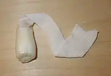 An anal plug (anal tampon or anal insert) is a medical device that is often used to treat fecal incontinence, the accidental passing of bowel moments, by physically blocking involuntary loss of fecal material.[1] Fecal material such as feces are solid remains of food that does not get digested in the small intestines; rather, it is broken down by bacteria in the large intestine. Anal plugs vary in design and composition, but they are typically single-use, intra-anal, disposable devices made out of soft materials to contain fecal material and prevent it from leaking out of the rectum. The idea of an anal insert for fecal incontinence was first evaluated in a study of 10 participants with three different designs of anal inserts.[1]