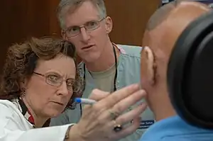 An anaplastologist (also known as a maxillofacial prosthetist and technologist in the United Kingdom) is an individual who has the knowledge and skill set to provide the service of customizing a facial (craniofacial prosthesis), ocular or somatic prosthesis. In locations around the world that facial, ocular and somatic prostheses are not readily available, a dentist who specializes in maxillofacial prosthetics (prosthodontics), or a dental technician or an ocularist, may also be titled an anaplastologist. In urban or more developed locations, an individual referred to as an anaplastologist is one who solely works with facial, ocular or somatic prostheses. In such a setting, the anaplastologist sometimes collaborates with prosthodontists and ocularists.