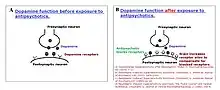 Whitaker begins by reviewing the discovery of antipsychotics, benzodiazepines and antidepressants. These were discovered as side effects during research for antihistamines (specifically promethazine), gram negative antibiotics (specifically mephenesin) and the anti-tuberculosis agents isoniazid and iproniazid respectively. The psychiatric mechanisms of action of these drugs were not known at the time and these were initially called major tranquilizers (now typical antipsychotics) due to their induction of "euphoric quietude"; minor tranquilizers (now benzodiazepines) and psychic energizers (now antidepressants) due to patients "dancing in the wards."[5] These compounds were developed during a period of growth for the pharmaceutical industry bolstered by the 1951 Durham-Humphrey Amendment, giving physicians monopolistic prescribing rights thus aligning the interests of physicians and pharmaceutical companies. This also followed the industry's development of "magic bullets" that treat people with, for example, diabetes, which according to Whitaker provided an analogy to sell the idea of these drugs to the public. It was not until many years later, after the mechanisms of these drugs were determined, that the serotonergic hypothesis of depression and dopaminergic hypothesis of schizophrenia were developed to fall in line with the drug's mechanisms. According to Whitaker's analysis of the primary literature, lower levels of serotonin and higher levels of dopamine "have proved to be true in patients WITH prior exposure to antidepressants or antipsychotics (ie as homeostatic mechanisms) but NOT in patients without prior exposure."