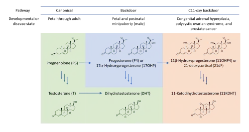 The androgen backdoor pathways are vital for creating androgens from 21-carbon (C