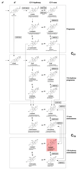 - ↑ van Rooyen D, Gent R, Barnard L, Swart AC (April 2018). "The in vitro metabolism of 11β-hydroxyprogesterone and 11-ketoprogesterone to 11-ketodihydrotestosterone in the backdoor pathway". primary. The Journal of Steroid Biochemistry and Molecular Biology. 178: 203–212. doi:10.1016/j.jsbmb.2017.12.014. PMID 29277707. S2CID 3700135.