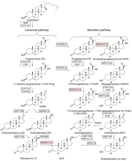 The backdoor pathway of DHT biosynthesis from 17OHP to DHT was first described in the marsupials and later confirmed in humans.[15][16][6] Both the canonical and backdoor pathways of DHT biosynthesis are required for normal development of male genitalia in humans. As such, defects in the backdoor pathway from 17α-hydroxyprogesterone (17OHP) or progesterone (P4) to DHT lead to undervirilization in male fetuses because placental P4 is the precursor of DHT via the backdoor pathway.[12]
