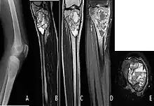 | A. X-ray: osteolytic lesion in tibia near knee. B/C/D/E. MRI with E showing fluid levels. | |