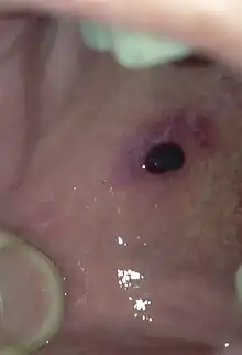 Angina bullosa haemorrhagica is a condition of the mucous membranes characterized by the sudden appearance of one or more blood blisters within the oral cavity.[1]: 808 The lesions, which may be caused by mild trauma to the mouth tissues such as hot foods, typically rupture quickly and heal without scarring or further discomfort.[2] The condition is not serious except in rare cases where a large bulla that does not rupture spontaneously may cause airway obstruction.