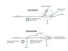 Balloon catheters used in angioplasty are either of Over-the-Wire (OTW) or Rapid Exchange (Rx) design. Rx catheters nowadays are about 90% of the Coronary Intervention market. While OTW Catheters may still be useful in highly tortuous vascular pathways, they sacrifice deflation time and pushability. When a balloon catheter is used to compress plaque within a clogged coronary artery, it is referred to as a plain old balloon angioplasty or POBA.[1] Balloon catheters are also utilized in the deployment of stents during angioplasty. Balloon catheters are supplied to the cath lab with a stent pre-mounted on the balloon. When the cardiologist inflates the balloon it expands the stent. When the cardiologist subsequently deflates the balloon, the stent stays behind in the artery and the balloon catheter can be removed. Stents that are used in conjunction with a balloon catheter are known as balloon expandable stents, as opposed to self-expandable stents, typically made of Nitinol alloy or polyester.