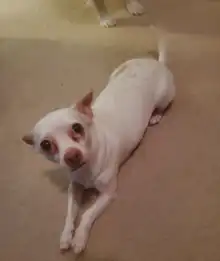 | A chihuahua with a carpal valgus deformity in the front left limb. | |