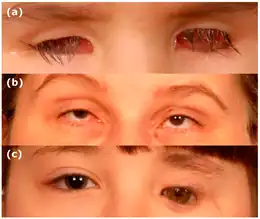 Anophthalmia (Greek: ἀνόφθαλμος, "without eye") is the medical term for the absence of one or both eyes. Both the globe and the ocular tissue are missing from the orbit.[1] The absence of the eye will cause a small bony orbit, a constricted mucosal socket, short eyelids, reduced palpebral fissure and malar prominence.[2] Genetic mutations, chromosomal abnormalities, and prenatal environment can all cause anophthalmia. Anophthalmia is an extremely rare disease and is mostly rooted in genetic abnormalities. It can also be associated with other syndromes.