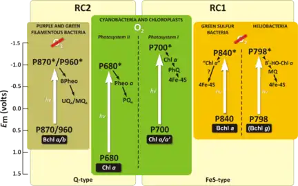 There are two main types of anaerobic photosynthetic electron transport chains in bacteria. The type I reaction centers are found in GSB, Chloracidobacterium, and Heliobacteria, while the type II reaction centers are found in FAPs and purple bacteria.[3][5]