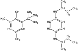 Synthetic phenolic antioxidants (SPAs)[35] and aminic antioxidants[36] have potential human and environmental health hazards. SPAs are common in indoor dust, small air particles, sediment, sewage, river water and wastewater.[37] They are synthesized from phenolic compounds and include 2,6-di-tert-butyl-4-methylphenol (BHT), 2,6-di-tert-butyl-p-benzoquinone (BHT-Q), 2,4-di-tert-butyl-phenol (DBP) and 3-tert-butyl-4-hydroxyanisole (BHA). BHT can cause hepatotoxicity and damage to the endocrine system and may increase tumor development rates due to 1,1-dimethylhydrazine.[38] BHT-Q can cause DNA damage and mismatches[39] through the cleavage process, generating superoxide radicals.[37] DBP is toxic to marine life if exposed long-term. Phenolic antioxidants have low biodegradability, but they do not have severe toxicity toward aquatic organisms at low concentrations. Another type of antioxidant, diphenylamine (DPA), is commonly used in the production of commercial, industrial lubricants and rubber products and it also acts as a supplement for automotive engine oils.[40]