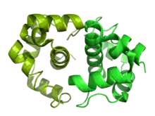 Anti-sigma factors are small proteins that bind to sigma factors and inhibit transcriptional activity in regulating prokaryote gene expression. Anti-sigma factors have both a sigma-binding domain and a sensory/signaling domain; this allows them to respond to signals inside and outside the cell.[1] Anti-sigma factors have been found in several bacteria, including Escherichia coli and Salmonella, and viruses such as the T4 bacteriophage. Anti-sigma factors have an antagonistic effect on sigma factors.[2] Each sigma factor has an associated anti-sigma factor that regulates it. These anti-sigma factors are divided into cytoplasmic-bound anti-sigma factors and inner membrane-bound anti-sigma factors. The differences in these sigma factors are where in the cell they are bound. Cytoplasmic-bound anti-sigma factors include FlgM, DnaK, RssB, and HscC. Inner membrane-bound anti-sigma factors, also called extra-cytoplasmic function (ECF) anti-sigma factors, include FecR and RseA. ECF anti-sigma factors tend to be more diverse in genetic sequence than cytoplasmic-bound anti-sigma factors.[3] These factors regulate many cellular processes, such as flagellum assembly, transport of materials, cell growth, and the cell's stress response.[4]