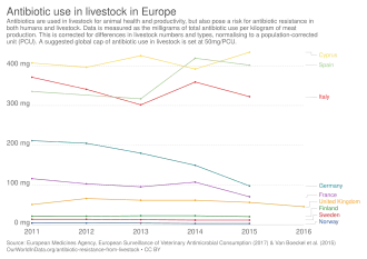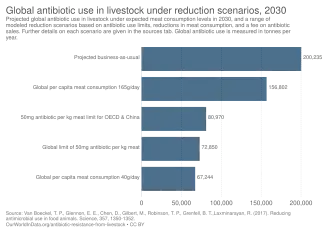 - ↑ Tang, Karen L; Caffrey, Niamh P; Nóbrega, Diego; Cork, Susan C; Ronksley, Paul C; Barkema, Herman W; Polachek, Alicia J; Ganshorn, Heather; Sharma, Nishan; Kellner, James D; Checkley, Sylvia L; Ghali, William A (August 2019). "Comparison of different approaches to antibiotic restriction in food-producing animals: stratified results from a systematic review and meta-analysis". BMJ Global Health. 2019 (4): e001710. doi:10.1136/bmjgh-2019-001710. PMC 6730577. PMID 31543995.
