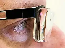 | A person with aphakia wearing cataract glasses, with extremely thick lenses to correct the typical extreme farsightedness. Before in-eye lens replacement was available, such glasses were much more common. | |