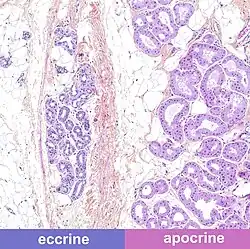![]() Microscopic photography of eccrine and apocrine sweats glands in dermis. | |