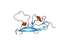 This protein domain is composed of four well-defined anti-parallel beta-strands and two short alpha-helices, as well as a long highly flexible loop.[22] Additionally, the fifth protein domain appears to resemble the other four in Apolipoprotein with the exception of three internal disulfide bonds and an extra C-terminal loop.[21]