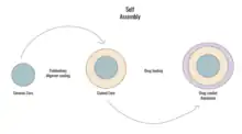 The three major units of aquasomes are fabricated together according to self-assembly, a thermodynamically driven process that organizes subunits of a system in a manner that results in the lowest Gibbs free energy available, known as ΔG. Self-assembly as a mixing process offers high accuracy and control over sizes on the nanometer scale, which is especially relevant for aquasomes, which exist on this size scale. The three layers of aquasomes can be synthesized differently using a variety of techniques depending on the intended functions or desired therapeutic effects.[1] The general scheme of aquasome fabrication involves a sequential synthesis of a nanocrystalline core, followed by a polyhydroxy coating, and finished with integration of bioactive molecules. Throughout this process, several intermittent steps are included that involve selective filtering and purification to remove byproducts while isolating the desired products for further processing.[1]