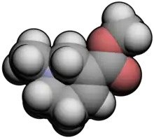 Arecoline is a base, and its conjugate acid has a pKa ~ 6.8.[3] Arecoline is volatile in steam, miscible with most organic solvents and water, but extractable from water by ether in presence of dissolved salts. Being basic, arecoline forms salts with acids. The salts are crystalline, but usually deliquescent: the hydrochloride, arecoline•HCl, forms needles, m.p. 158 °C;[3] the hydrobromide, arecoline•HBr, forms slender prisms, mp. 177–179 °C from hot methanol; the aurichloride, arecoline•HAuCl4, is an oil, but the platinichloride, arecoline2•H2PtCl6, mp. 176 °C, crystallizes from water in orange-red rhombohedrons. The methiodide forms glancing prisms, mp. 173-174 °C.