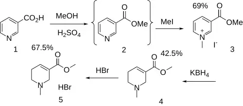 Fischer esterification of nicotinic acid (niacin) (1) gives methyl nicotinate (2). Alkylation with methyl iodide then gives 3-methoxycarbonyl-1-methylpyridinium iodide (3). Hydride reduction with an agent such as potassium borohydride thus gives the tetrahydropyridine (4). Salt formation with HBr completes the synthesis (5).