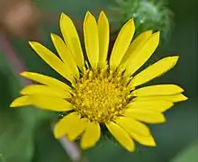 The flowering season is between May and August (Central Europe). The 2 in (5.1 cm) flower heads are composed of orange-yellow disc florets in the centre which are externally bordered by 10 to 15 yellow ray florets. The achenes have a one-piece rough pappus which opens in dry conditions.[6][7] Arnica montana is a hemicryptophyte,[8] which helps the plant to survive the extreme overwintering condition of its habitat. In addition, Arnica forms rhizomes, which grow in a two-year cycle: the rosette part grows at its front while its tail is slowly dying.[9]
