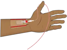 An arterial line is usually inserted into the radial artery in the wrist, but can also be inserted into the brachial artery at the elbow, into the femoral artery in the groin, into the dorsalis pedis artery in the foot, or into the ulnar artery in the wrist.[2] A golden rule is that there has to be collateral circulation to the area affected by the chosen artery, so that peripheral circulation is maintained by another artery even if circulation is disturbed in the cannulated artery.[3]