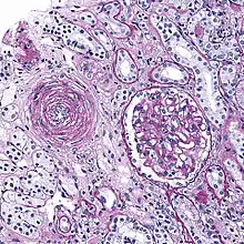 This is a type of arteriolosclerosis involving a narrowed lumen.[4] The term "onion-skin" is sometimes used to describe this form of blood vessel[14] with thickened concentric smooth muscle cell layer and thickened, duplicated basement membrane. In malignant hypertension these hyperplastic changes are often accompanied by fibrinoid necrosis of the arterial intima and media. These changes are most prominent in the kidney and can lead to ischemia and acute kidney failure. In the brain, a small cavity called a lacune is an ischemic cavity that can arise due to brain necrosis, due to arteriolosclerosis.[15][16]