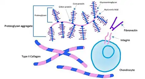 Cartilage is an avascular, aneural and alymphatic tissue within the body.[5] The extracellular matrix (ECM) of collagen is what gives it its high strength. The figure below shows the components of the ECM.