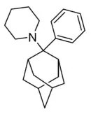 - ↑ Eaton TA, Houk KN, Watkins SF, Fronczek FR (April 1983). "Geometries and conformational processes in phencyclidine and a rigid adamantyl analogue: variable-temperature NMR, X-ray crystallographic, and molecular mechanics studies". Journal of Medicinal Chemistry. 26 (4): 479–86. doi:10.1021/jm00358a005. PMID 6834381.
