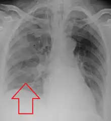 Aspiration pneumonia is a type of lung infection that is due to a relatively large amount of material from the stomach or mouth entering the lungs.[1] Signs and symptoms often include fever and cough of relatively rapid onset.[1] Complications may include lung abscess, acute respiratory distress syndrome, empyema, parapneumonic effusion, and pneumonia[3][1] Some include chemical induced inflammation of the lungs as a subtype, which occurs from acidic but non-infectious stomach contents entering the lungs.[1][2]