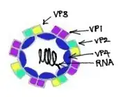 Rhinoviruses are known to be the most important common cold viruses.[15] They are ssRNA positive-strand viruses with no DNA stage, and are classified within the family Picornaviridae.[15] Rhinoviruses are small, with the length of approximately 30 nm, and do not contain an envelope.[15] Their icosahedral capsids contain 4 proteins: VP1, VP2, VP3 and VP4. VP1, VP2, and VP3 are located on the surface of the capsid and are responsible for the antigenic diversity of Rhinoviruses.[15] In contrast, VP4 is located inside the virus and its function is to anchor the RNA core to the viral capsid.[16] While sharing basic properties with enteroviruses, such as size, shape, nucleic acid composition, and ether-resistance, rhinoviruses are distinguished from enteroviruses by having a greater buoyant density and a susceptibility to inactivation if they are exposed to an acidic environment.[15] Nevertheless, they share a common ancestor with enteroviruses.[15]