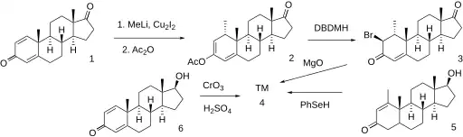 - ↑ Künzer H, Sauer G, Wiechert R (1989). "Regioselective synthesis of ring a polymethylated steroids in the androstane series". Tetrahedron. 45 (20): 6409–6426. doi:10.1016/S0040-4020(01)89518-1.