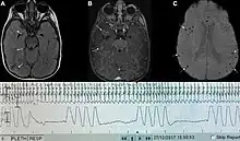 Ataxic respirations, also known as Biot's respirations or Biot's breathing, is an abnormal pattern of breathing characterized by variable tidal volume, random apneas, and no regularity.[1] It is named for Camille Biot, who characterized it in 1876.[2][3] Biot's respiration is caused by damage to the medulla oblongata and pons due to trauma, stroke, opioid use, and increased intracranial pressure due to uncal or tentorial herniation.[1][4] Often this condition is also associated with meningitis.[2] In common medical practice, Biot's respiration is often mistaken for Cheyne–Stokes respiration, part of which may have been caused by them both being described by the same person and subtle differences between the types of breathing.[1][3]
