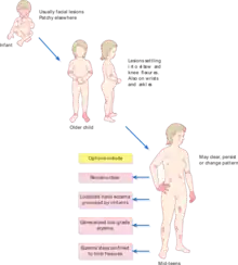 | Dermatitis is visible on flexural surfaces (people ≥ age 4) or on the cheeks, forehead, and extensor surfaces (people < age 4) |