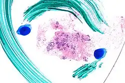 | Very low magnification micrograph of atypical ductal hyperplasia (ADH). The piece with ADH was circled by the pathologist with a marker, as it is so small, and sent for an additional opinion. H&E stain. | |