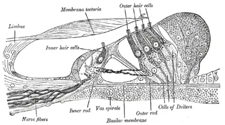 ![]() Three rows of outer hair cells in the organ of Corti, one row of inner hair cells. | |