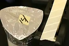 Autoclave tape is an adhesive tape used in autoclaving (heating under high pressure with steam to sterilise) to indicate whether a specific temperature has been reached.[1] Autoclave tape works by changing color after exposure to temperatures commonly used in sterilization processes, typically 121°C in a steam autoclave.
