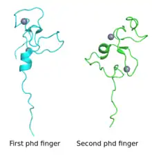 - ↑ Aasland R, Gibson TJ, Stewart AF (February 1995). "The PHD finger: implications for chromatin-mediated transcriptional regulation". Trends in Biochemical Sciences. 20 (2): 56–9. doi:10.1016/s0968-0004(00)88957-4. PMID 7701562.