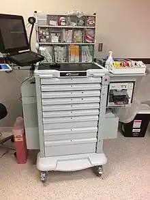 An automated dispensing cabinet (ADC), also called a unit-based cabinet (UBC), automated dispensing device (ADD), or automated dispensing machine (ADM), is a computerized medicine cabinet for hospitals and healthcare settings. ADCs allow medications to be stored and dispensed near the point of care while controlling and tracking drug distribution.