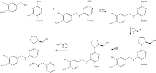 Avanafil can be synthesized from a benzylamine derivative and a pyrimidine derivative:[4]
