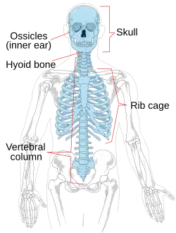 The axial skeleton is the core part of the endoskeleton made of the bones of the head and trunk of vertebrates. In the human skeleton, it consists of 80 bones and is composed of the skull (28 bones, including the cranium, mandible and the middle ear ossicles), the vertebral column (26 bones, including vertebrae, sacrum and coccyx), the rib cage (25 bones, including ribs and sternum), and the hyoid bone.[1] The axial skeleton is joined to the appendicular skeleton (which support the limbs) via the shoulder girdles and the pelvis.
