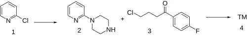 The alkylation of 2-chloropyridine (1) with piperazine gives 1-(pyridin-2-yl)piperazine [67980-77-2] (2). The attachement of the sidechain by reaction with 4-chloro-4'-fluorobutyrophenone [3874-54-2] (3) completed the synthesis of azaperone (4).