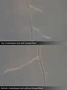 Azospirillum promote plant growth through a variety of mechanisms. Many Azospirillum excrete plant hormones that alter how the roots of plants grow. Affected roots frequently grow more branches and fine root hairs, which may help the plants acquire water and nutrients more efficiently.[14] In addition to these changes, Azospirillum can also alter the forms of plant nutrients such as nitrogen and phosphorus to make them more available to plants.[14] However, how much nitrogen Azospirillum contribute to crop plants via biological fixation is debated.[15] Azospirillum also make antioxidants that protect the plant roots from stresses due to drought and flooding.[14]