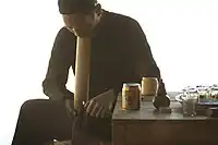 Nicotiana rustica is called mapacho in South America. It is often used for entheogenic purposes by South American shamans,[8] because of the comparatively high levels of harmala alkaloids and nicotine.[9] There are many methods of administration in South American ethnobotanical preparations. In a preparation known as singado or singa, N. rustica is allowed to soak or be infused in water, and the water is then insufflated. In Peru it is known as "Mapacho" and is smoked in pipes, or drunk as a juice. The plant can also be smoked in cigars, administered as an enema, and made into a lickable product known as ambil. Finally, N. rustica is a common ingredient in rapé, a smokeless tobacco product usually used as a nasal snuff. (See also Göteborgs Rapé.) Rapé is often a combination of N. rustica and a host of other herbs, depending on the intended use, including tonka beans, cinnamon, clove buds, soda ash[4] (creating nu-nu), Anadenanthera, Erythroxylum, Virola, and more.[10]