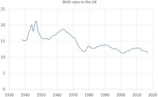The baby boomers are commonly defined as the generation born after the Second World War, generally from 1946 to 1964. However, this definition of baby boomers is based on American demographic trends which saw a surge in births post Second World War that was sustained into the 1960s. In the UK, the post Second World War surge in births was confined to a sharp spike in 1946, after which the number of births dropped again. Then the post-World War babies started having their babies, giving rise to the births that can be seen across the 1960s. Due to the different demographic profile seen in the UK compared to America, British people usually define as those born between 1960 and 1969 (inclusive) as baby boomers.[29]