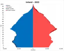 Ireland has a much younger population compared to Europe overall, with one in four people under age 15.[10] This is likely due to the baby boom experienced in the late 2000s and early 2010s, after the Great Recession. The number of births in Ireland reached a 118-year high in 2009 when the economy experienced its worst year on record. The number of births had remained stable with 74,650 babies born in 2012, higher than the 65,600 average during the Celtic Tiger (1995–2007), despite the struggle to emerge from financial crisis.[11]