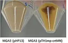| Cell pellets of recombinant B. methanolicus MGA3 (pHP13) and MGA3 (pTH1mp-crtMN) strains cultivated in SWE50 medium.[1] | |
