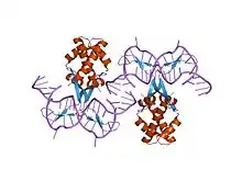 - ↑ Balandina A, Kamashev D, Rouviere-Yaniv J (August 2002). "The bacterial histone-like protein HU specifically recognizes similar structures in all nucleic acids. DNA, RNA, and their hybrids". The Journal of Biological Chemistry. 277 (31): 27622–8. doi:10.1074/jbc.M201978200. PMID 12006568.