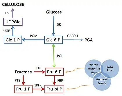 The synthesis of bacterial cellulose is a multistep process that involve two main mechanisms: the synthesis of uridine diphosphoglucose (UDPGIc), followed by the polymerization of glucose into long and unbranched chains (the β-1→4 glucan chain) by cellulose synthase. Specifics on the cellulose synthesis has been extensively documented.[12][13] The former mechanism is well known while the latter still needs exploring. The production of UDPGIc starts with carbon compounds (such as hexoses, glycerol, dihydroxyacetone, pyruvate, and dicarboxylic acids) entering the Krebs cycle, gluconeogenesis, or the pentose phosphate cycle depending on what carbon source is available. It then goes through phosphorylation along with catalysis, followed by isomerization of the intermediate, and a process known as UDPGIc pyrophosphorylase to convert the compounds into UDPGIc, a precursor to the production of cellulose. The polymerization of glucose into the β-1→4 glucan chain has been hypothesized to either involve a lipid intermediate[14] or not to involve a lipid intermediate,[12] though structural enzymology studies and in vitro experiments indicate that polymerization can occur by direct enzymatic transfer of a glucosyl moiety from a nucleotide sugar to the growing polysaccharide.[15] A. xylinum usually converts carbon compounds into cellulose with around 50% efficiency.[14]