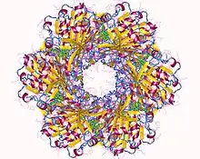 The cyanobacterial circadian system is so far unique in that it is the only circadian system in which the structures of full-length clock proteins have been solved. In fact, the structures of all three of the Kai proteins have been determined. KaiC forms a hexamer that resembles a double doughnut with a central pore that is partially sealed at one end.[30] There are twelve ATP-binding sites in KaiC and the residues that are phosphorylated during the in vitro phosphorylation rhythm have been identified.[31][32] KaiA has two major domains and forms dimers in which the N-terminal domains are "swapped" with the C-terminal domains.[33][34] KaiB has been successfully crystallized from three different species of cyanobacteria and forms dimers or tetramers.[35][36]