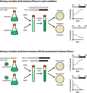 Do circadian timekeepers enhance the fitness of organisms growing under natural conditions? Circadian clocks are assumed to enhance the fitness of organisms by improving their ability to predict and anticipate daily cycles in environmental factors. However, there have been few rigorous tests of this proposition in any organism. [13] Cyanobacteria are one of the few organisms in which such a test has been performed. The adaptive fitness test was done by mixing cyanobacterial strains that express different circadian properties (i.e., rhythmicity vs. arhythmicity, different periods, etc.) and growing them in competition under different environmental conditions. The idea was to determine if having an appropriately functional clock system enhances fitness under competitive conditions. The result was that strains with a functioning biological clock out-compete arhythmic strains in environments that have a rhythmic light/dark cycle (e.g., 12 hours of light alternating with 12 hours of darkness), whereas in "constant" environments (e.g., constant illumination) rhythmic and arhythmic strains grow at comparable rates.[14] Among rhythmic strains with different periods, the strains whose endogenous period most closely matches the period of the environmental cycle is able to out-compete strains whose period does not match that of the environment.[15] Similar results were later obtained in plants[16] and mice.[17]
