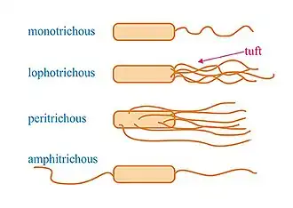 Different types of cell flagellation are found depending on the number and arrangement of the flagella on the cell surface, e.g., only at the cell poles or spread over the cell surface.[23] In polar flagellation, the flagella are present at one or both ends of the cell: if a single flagellum is attached at one pole, the cell is called monotrichous; if a tuft of flagella is located at one pole, the cells is lophotrichous; when flagella are present at both ends, the cell is amphitrichous. In peritrichous flagellation, the flagella are distributed in different locations around the cell surface. Nevertheless, variations within this classification can be found, like lateral and subpolar—instead of polar—monotrichous and lophotrichous flagellation.[24][3]