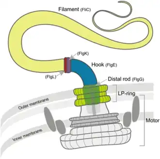 The bacterial flagellum is a protein-nanomachine that converts electrochemical energy in the form of a gradient of H+ or Na+ ions into mechanical work.[26][27][28] The flagellum is composed of three parts: the basal body, the hook, and the filament. The basal body is a reversible motor that spans the bacterial cell envelope. It is composed of the central rod and several rings: in Gram-negative bacteria, these are the outer L-ring (lipopolysaccharide) and P-ring (peptidoglycan), and the inner MS-ring (membrane/supramembrane) and C-ring (cytoplasmic). In Gram-positive bacteria only the inner rings are present.[29] The Mot proteins (MotA and MotB) surround the inner rings in the cytoplasmic membrane; ion translocation through the Mot proteins provide the energy for flagella rotation.[26] The Fli proteins allow reversal of the direction of rotation of the flagella in response to specific stimuli.[30][31] The hook connects the filament to the motor protein in the base. The helical filament is composed of many copies of the protein flagellin, and it can rotate clockwise (CW) and counterclockwise (CCW).[32][33][34][35][3]